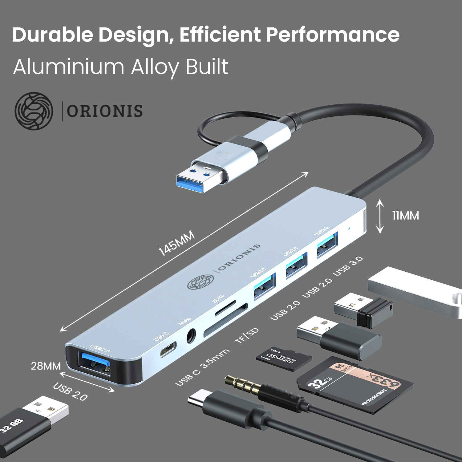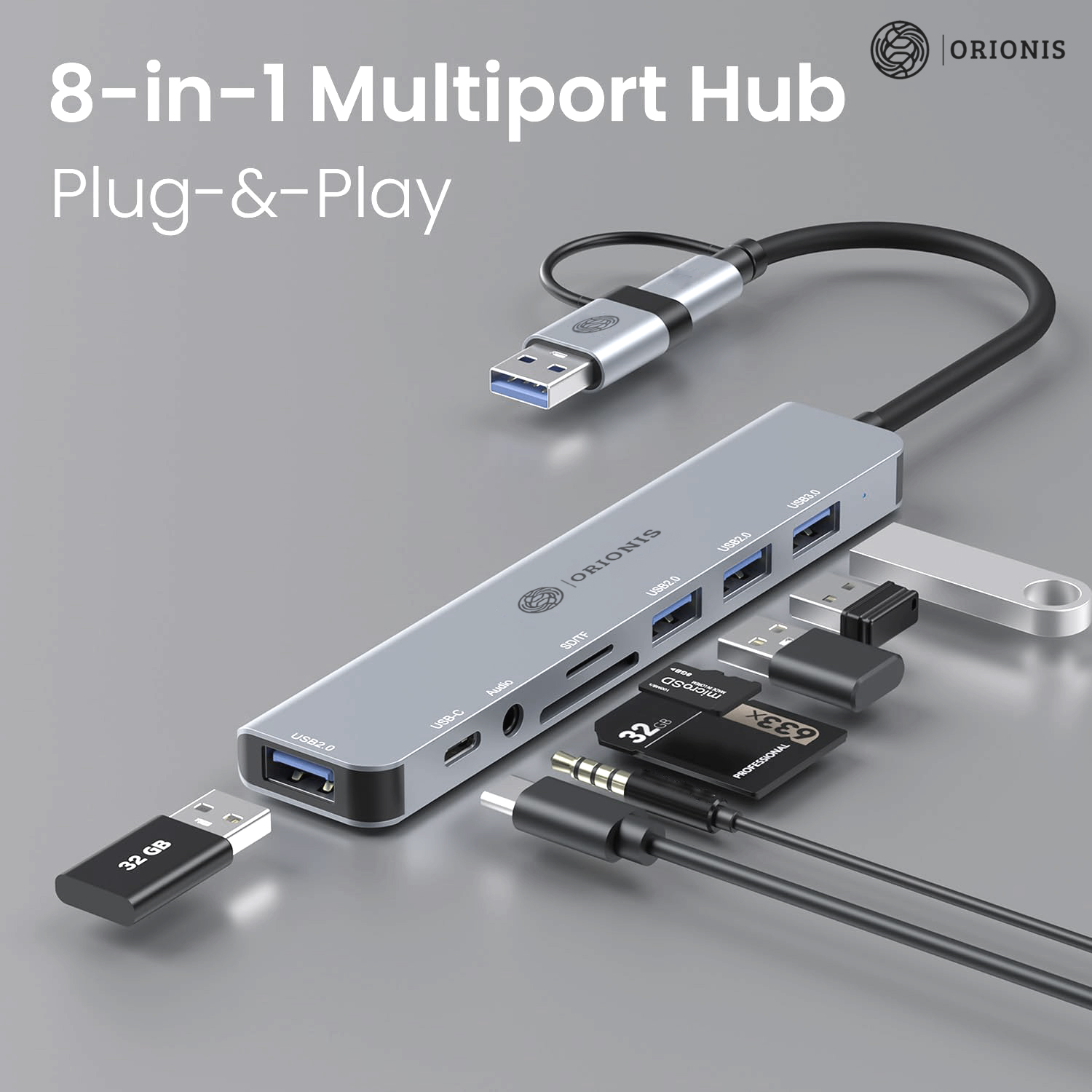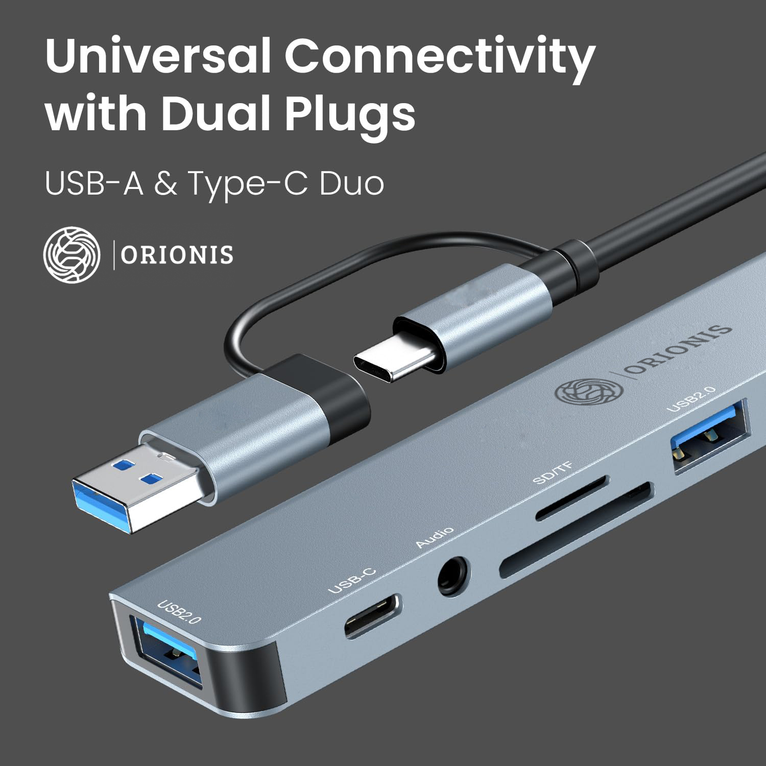Orionis 8-in-1 Dual Hub Dock | Type-C & USB Multiport Adapter with AUX, USB 3.0, PD Charging, SD/microSD Card Reader for Laptop, Mac & PC